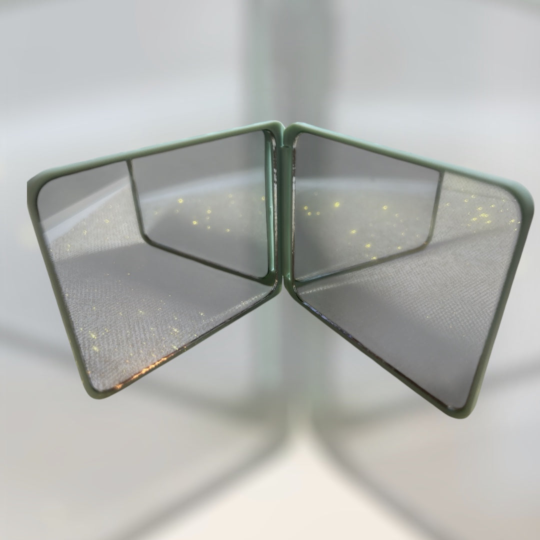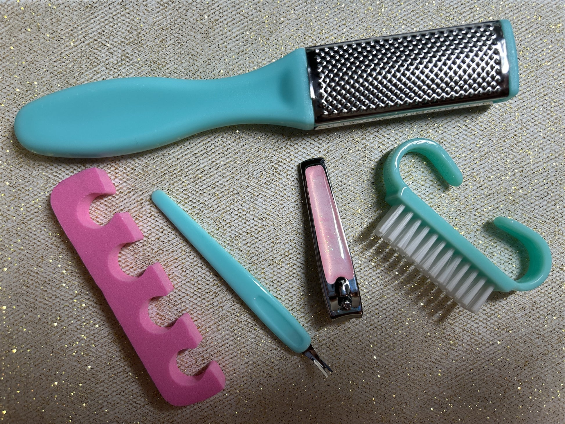 Caja de regalo con artículos para dama. Incluye bolso (para maquillaje y/o artículos de belleza), espejo, set pedicura, lima de uñas y crema de manos.